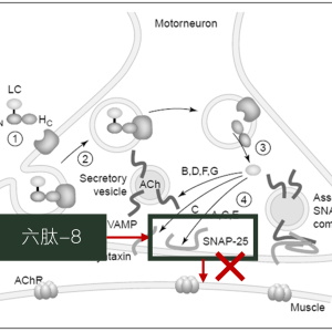 模仿SNARE复合物中SNAP-25蛋白(一种膜蛋白,与囊泡相关,直接调控SNARE复合物的结合和囊泡融合)的N-末端结构域,可以与SNAP-25竞争复合物中的位置,影响SNARE复合物的形成和稳定,使囊泡不能有效与膜结合释放出乙酰胆碱,从而阻断肌肉电脉冲信号,抑制神经递质释放,使脸部肌肉放松,达到抚平纹理的效果